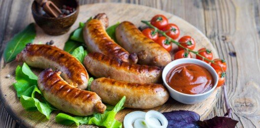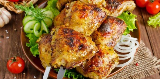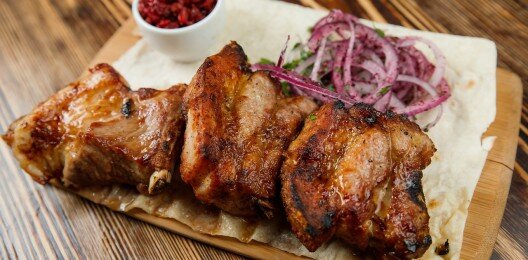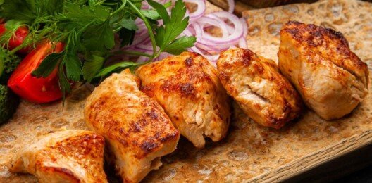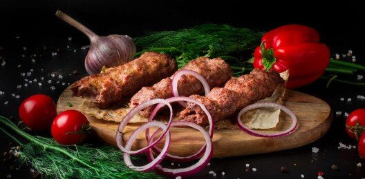 Люля-кебаб из курицы, лаваш, маринованный лук, томатный соус, фирменный соус